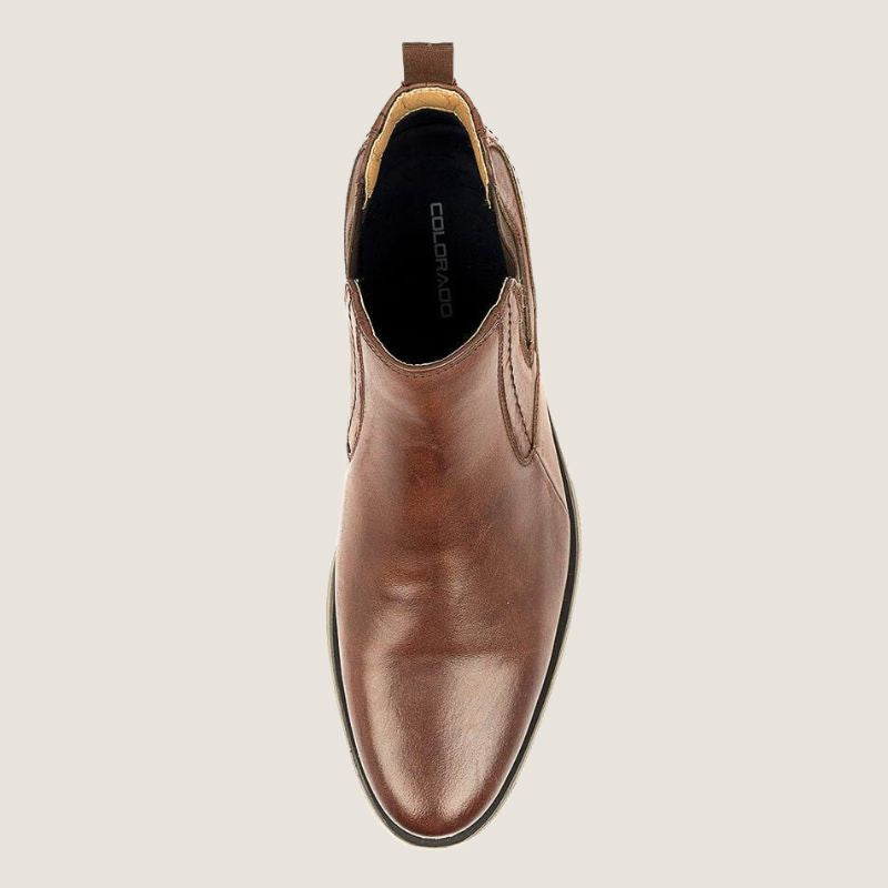 These leather Chelsea boots are a wardrobe essential for work and weekend. A removable foam footbed and durable rubber sole makes Mills by Colorado a comfortable choice with low-fuss looks.