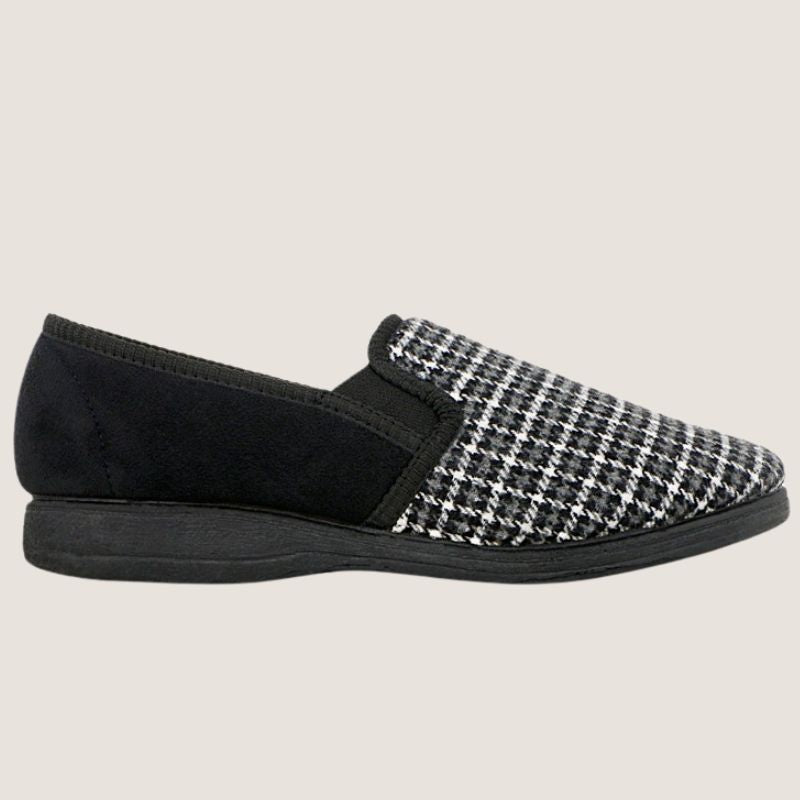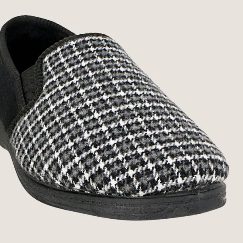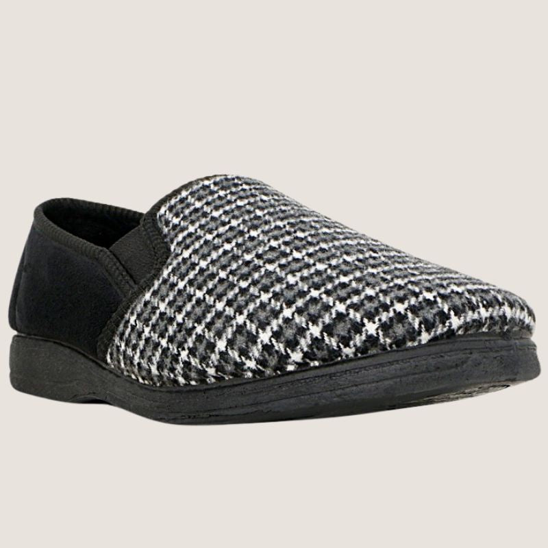 Keep your feet warm and comfortable all year round in the Grosby Peter Slipper in charcoal/black heather. This slipper features a grippy outsole, elastic side gussets, and a glen plaid print. These are the best house shoes.