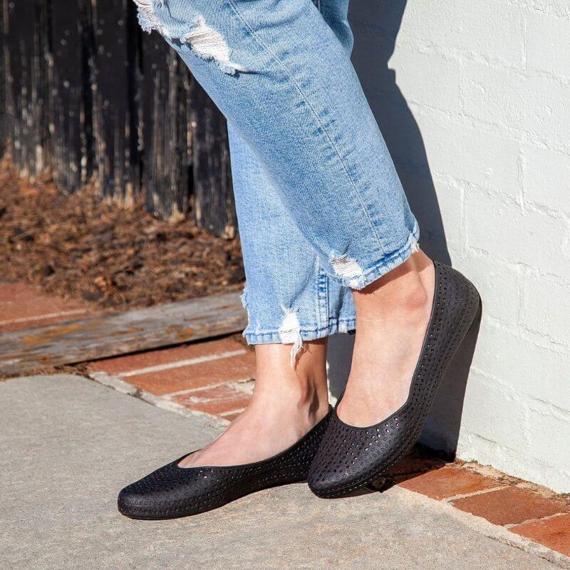 The Samantha is a jelly ballet flat with a twist. Remember the jellies we all loved growing up? This is the comfortable grown-up version. Paired super-soft, super-flexible material with perforations for ultimate comfort and breathability. This pointed-toe versatile flat is perfect for the office and around town. Like all Okabashi shoes, the Samantha is machine washable and 100% recyclable.