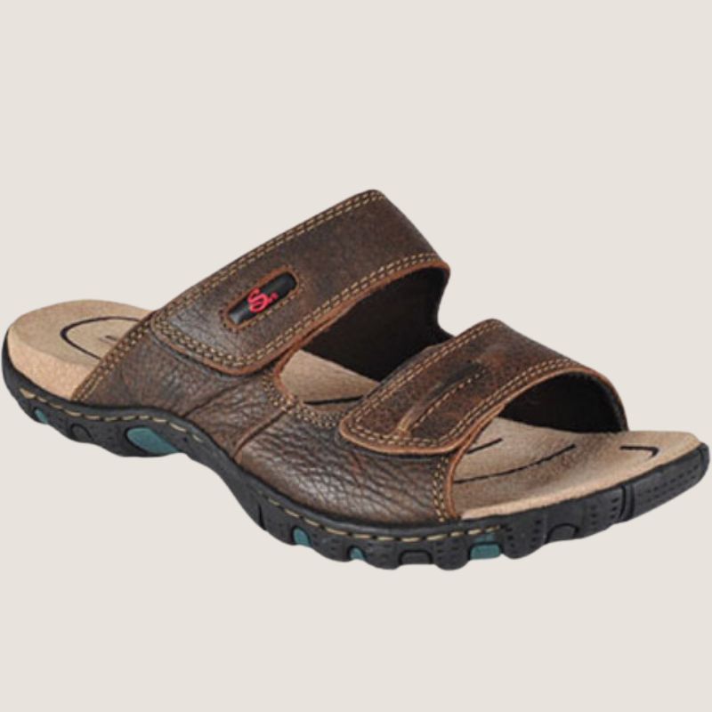 These premium leather slip-on sandals contain padded leather lined insole for superior comfort. Featuring hand-sewn upper to the outsole with dual adjustable straps for maximum adjustment and durable rubber outsole with cantilever technology to add a spring to every step.